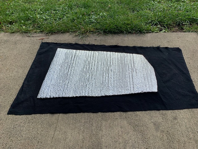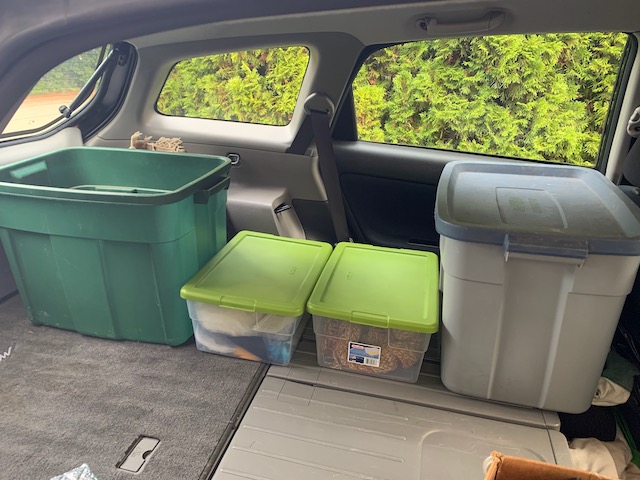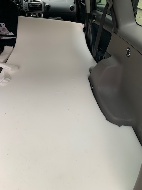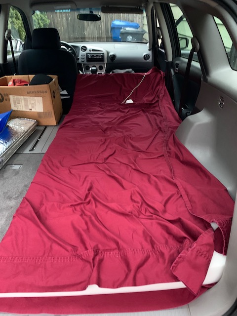 With inspiration from YouTube, Facebook, and Instagram I came up with a plan for my car – made black out covers for the windows to keep the light and curious eyes out, bought stretchy nylon mesh screens to keep the bugs out but let ventilation through, ordered a piece of upholstery foam to sleep on. Two large totes fit perfectly along the one side with room for some smaller plastic bins in between. Fortunately, in a Matrix the back seats fold completely flat. Taking out the front (passenger) seat would make room for a cooler and allow a flat sleeping surface. I cut the foam to fit up snug(ish)ly up against the side of the car.